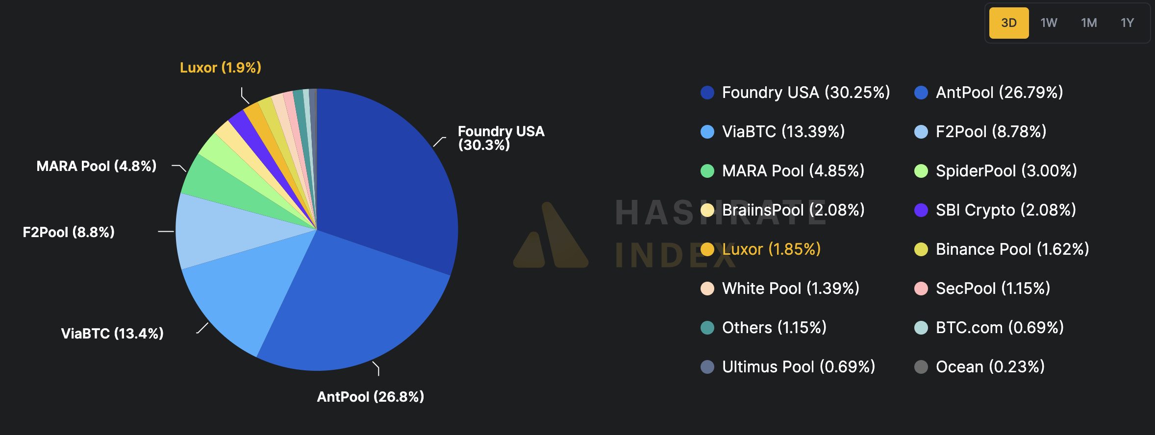 AntPool and FoundryUSA are the two biggest pools and are responsible for ~ 57% of hashrate.